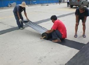 10、如果安裝中出現(xiàn)了條紋,任何在鋪裝方向上出現(xiàn)的大于2.5厘米的條紋都必須被割開并迭合起來,并且手工將迭合處浸漬在瀝青層中. 聚酯玻纖布必須使用輥壓或刷子刷,以保證它與路面的充分接觸并除去氣泡.熱瀝青的涂覆寬度必須在聚酯玻纖布的寬度上再加4英寸. 聚酯玻纖布在曲線面上不易彎曲或伸展.在曲面上安裝施工時(shí)可以將布截短,可以機(jī)械或手工進(jìn)行安裝.